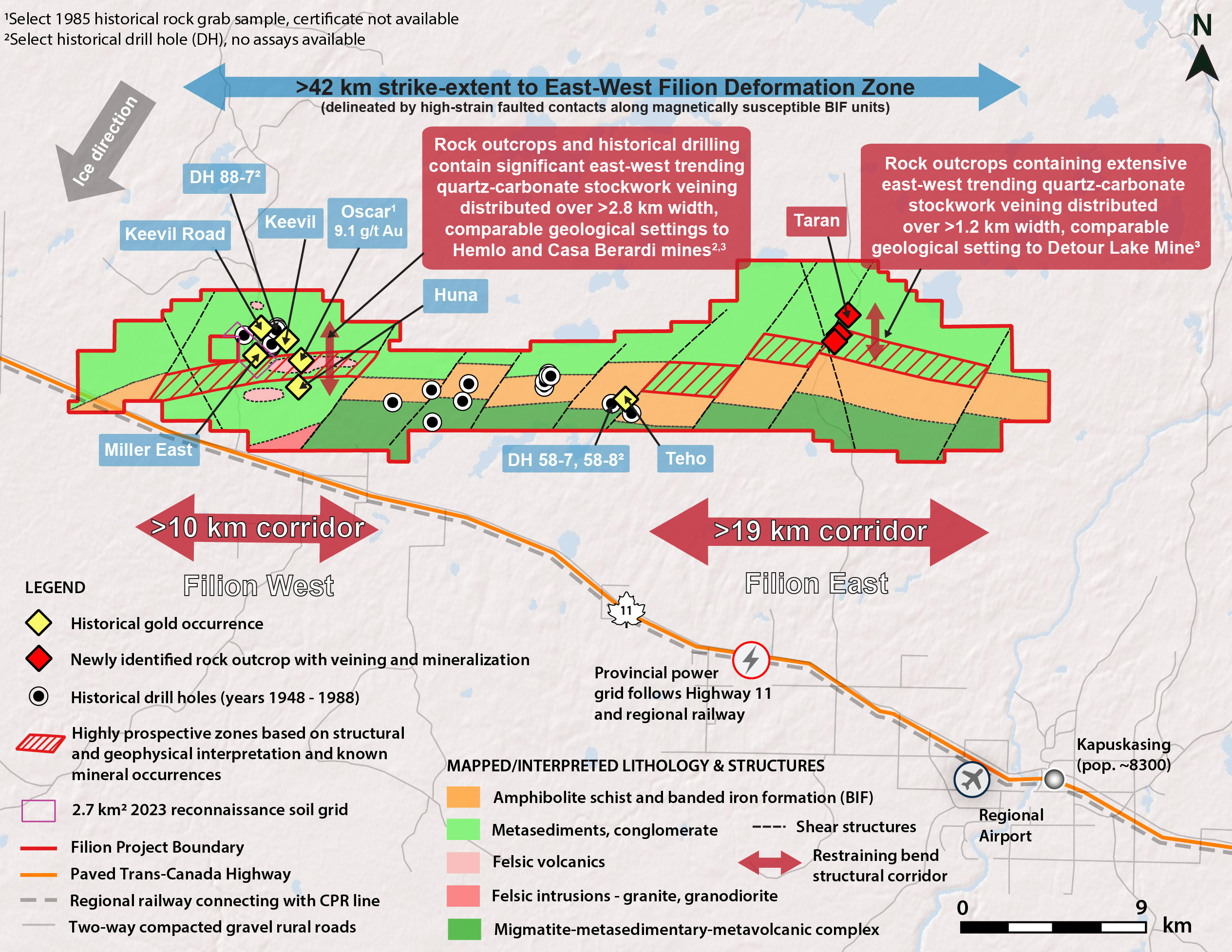 - Filion West (Figure 2): A >10 km structural corridor that encompasses a major structural restraining bend within the Filion Deformation Zone (Figure 2) that lies between two east-west trending high magnetic linear geophysical anomalies caused by nearby banded iron formation (Figure 2). This style of reduced geophysical response in the total magnetics in proximity to a significant deformation zone is comparable to the structural corridors that host gold mineralization at the Hemlo and Casa Berardi mines6.