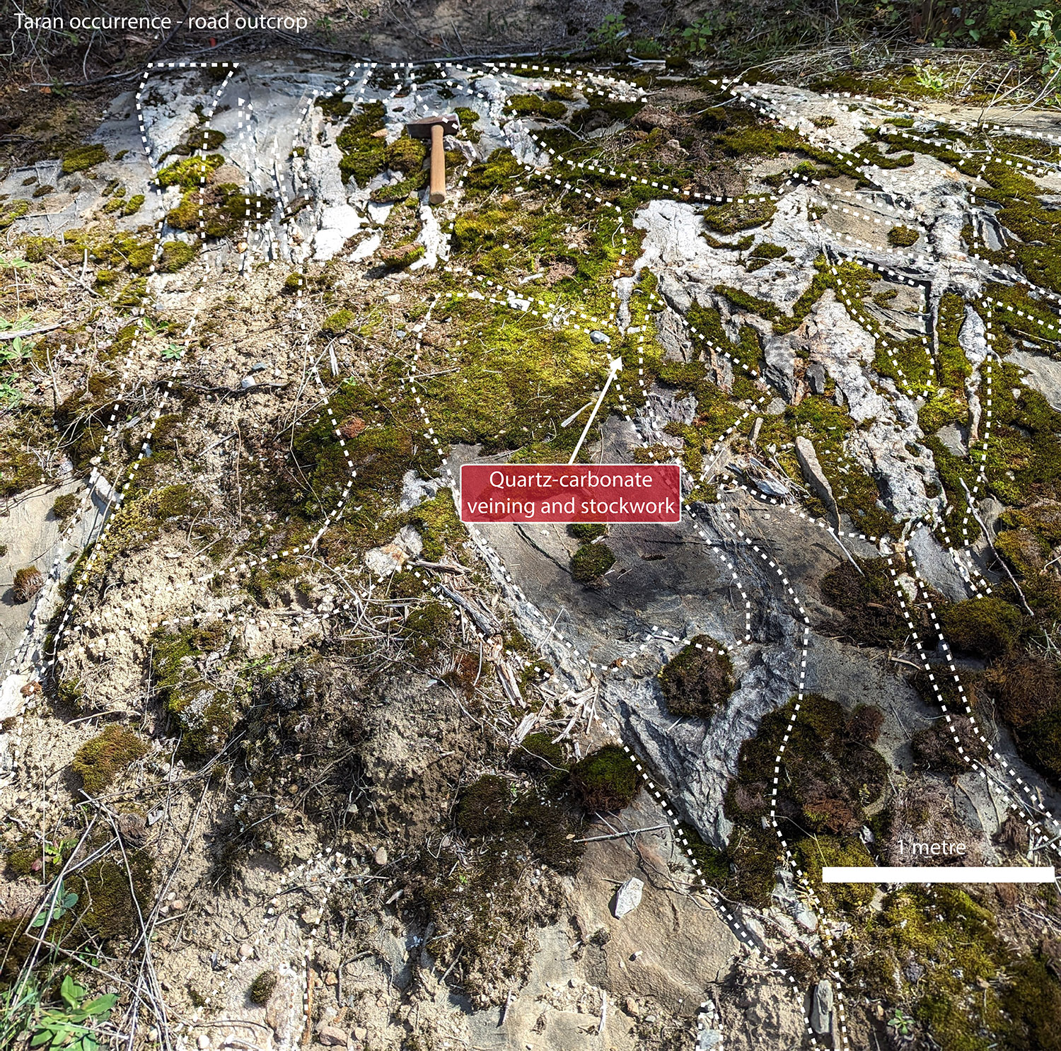 - Newly identified prospective targets demonstrate potential for new district-scale discovery upside potential, Torr is the first to ever conduct exploration reconnaissance in the Taran occurrence area (Figure 2, 3) and was able to quickly identify 3 road outcrops distributed across 1.2 km that contained extensive east-west trending quartz-carbonate stockwork veining (Figure 3) hosting pyrite and arsenopyrite mineralization. Increased abundance in veining and mineralization was also observed in proximity to a quartz-feldspar porphyry contact with metasediments at the main occurrence. This style of veining together with chlorite-sericite-silica-fuchsite alteration suggests a fertile geological setting that is associated with gold endowment within the region.