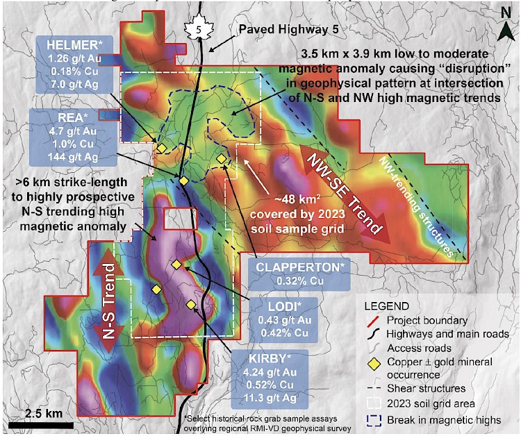 - High magnetic anomalies: surface geochemical sampling tested >6 kilometres (km) of strike-length to a north-south trending high magnetic anomaly coincident with the Lodi and Kirby copper-gold occurrences, the latter containing historical rock grab samples taken from outcrop exposures of quartz-carbonate veining within propylitic altered Nicola Group volcanics that yielded up to 4.24 grams per tonne (g/t) gold (Au), 0.52% copper (Cu), and 11.3 g/t silver (Ag) (Figure 1).