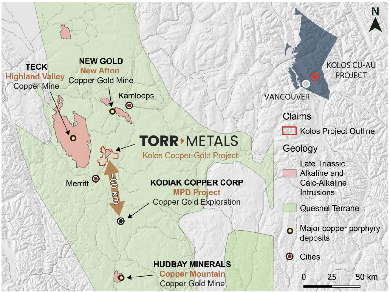 Torr Metals is a Vancouver based mineral exploration company focused on defining and developing the substantial exploration potential of the ~140 km2 Kolos Copper-Gold Project, located within the prolific Quesnel Terrane in Central British Columbia. Year-round access is provided by Highway 5, with the project being favourably located 23 km north of the city of Merritt and 286 km by highway from Vancouver, British Columbia. For further details about the Company’s additional 689 km2 Latham Copper-Gold Project please refer to the Company's website or current geological Technical Report (August 24, 2021) filed on November 25, 2021 under the Company's profile on SEDAR at www.sedar.com.