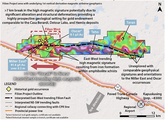 Figure 1. Filion Project location with underlying 1st derivative airborne magnetic geophysics at 200 m line spacing (Source: Canadian and Ontario Geological Surveys) annotated with historical gold occurrences, rock grab sampling, and structural interpretation.
