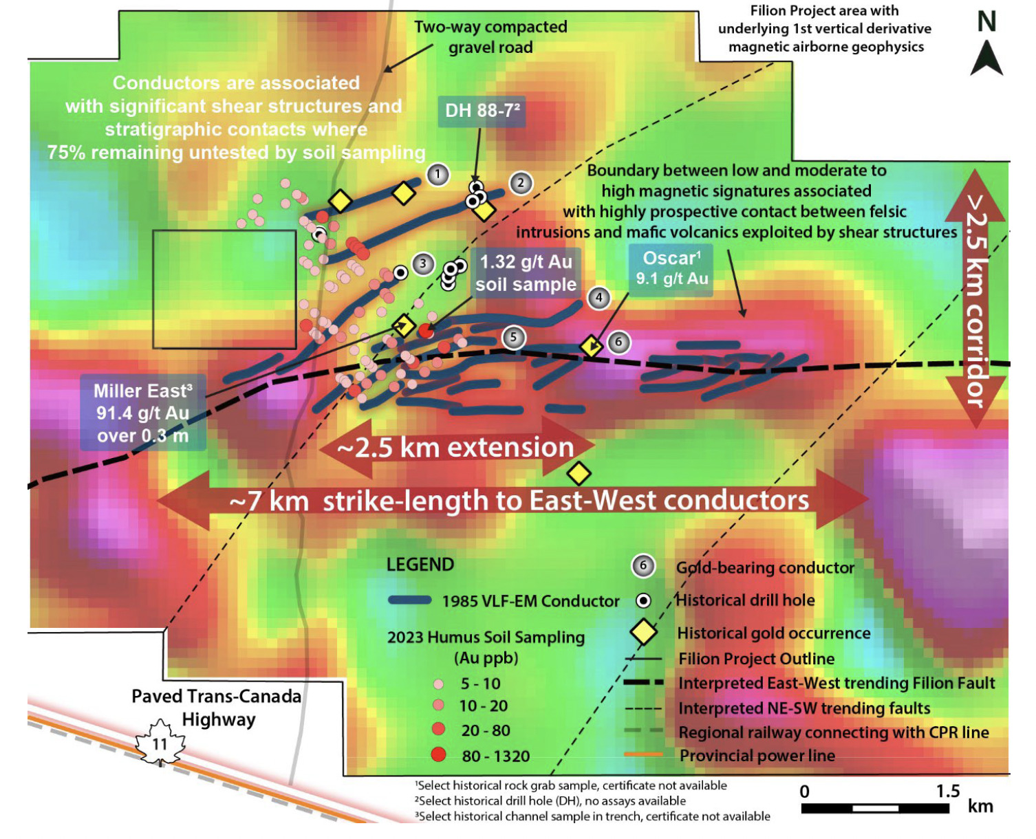 Figure 2. Filion West displaying location of anomalous gold in 2023 humus soil samples and 1985 VLF-EM conductors coincident with linear moderate to high magnetic signatures from airborne geophysics. Conductors occur within a highly prospective >7 km dilational bend of the Filion Fault, resulting in a “break” in the east-west trending high magnetic (iron formation) signature.