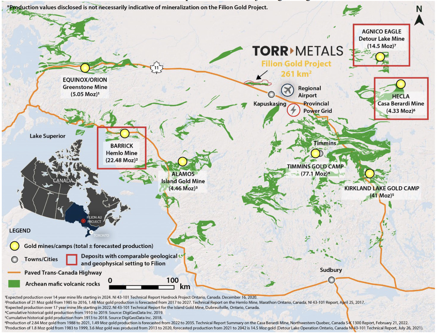 Figure 3. Filion Project location within the prolific gold-endowed greenstone belts of the Wabigoon, Wawa, and Abitibi subprovinces of northern Ontario. Figure includes the positions as well as total historical and forecasted production of major regional gold mines.