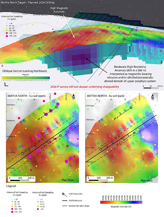 The Bertha North target (formerly Target 2) is defined by a moderate-to-high resistivity anomaly coincident with a strong magnetic response, interpreted to reflect magnetite-bearing intrusive rocks consistent with an alkalic porphyry environment. This geophysical signature is spatially associated with an approximately 800 metre (m) by 500 m historical copper and gold soil anomaly (see Target 2, July 22, 2025 news release), with values up to 528 parts per million (ppm) copper (Cu) and 20 parts per billion (ppb) Au (Figure 1, Figure 2). Indications of an underlying chargeability have been detected at the depth limits of the IP survey, suggesting additional prospectivity at depth. Surveys within the target area also identified diorite and monzonite intrusions, further supporting the interpretation of an intrusive copper-gold porphyry source.