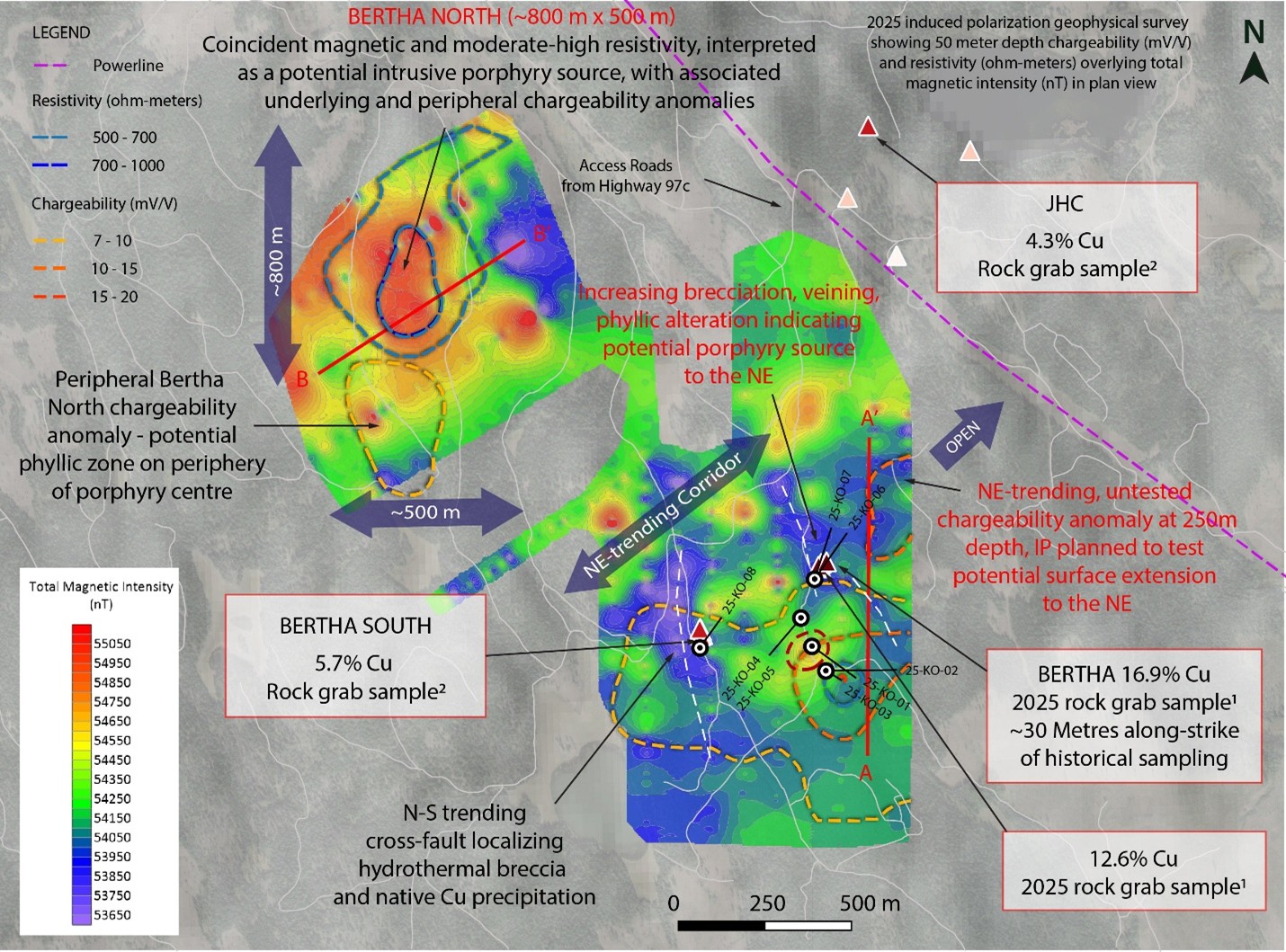 Figure 1. Plan view of the 2025 total magnetic intensity ground magnetic survey with selected rock grab samples, location of 2025 drill holes, and coincident chargeability and resistivity anomalies outlining the Bertha and Bertha North Cu-Au porphyry targets.