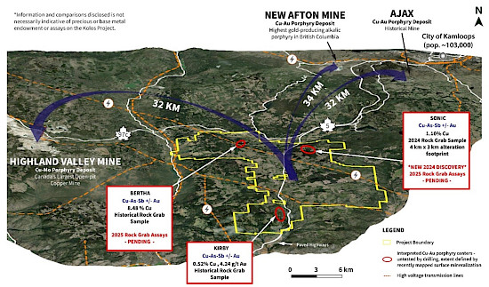 Figure 1. Kolos Project location with annotated alkalic copper-gold porphyry centers and location of nearby major copper deposits and mines.