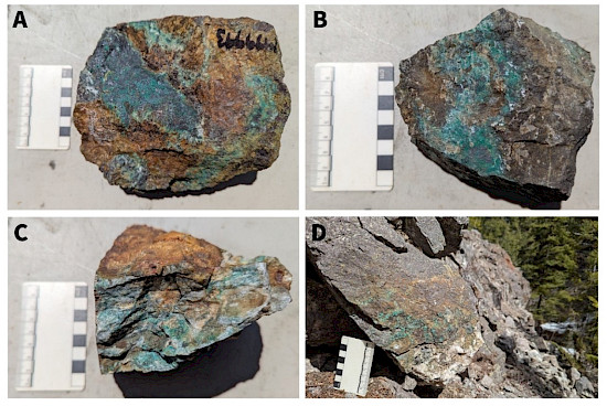 Figure 2. Select 2025 rock grab samples from the Bertha and Sonic Zones, assays pending. A,B. Bertha open pit containing abundant chalcocite with malachite staining within a fragmental volcanic host rock. C. Sonic Zone malachite staining with blebs of chalcopyrite associated with localized potassic alteration within dense quartz-carbonate veining adjacent to aplitic and silica dykes. D. Style of mineralization within the Bertha pit wall where historical sampling has yielded up to 8.48% copper in rock grab samples.