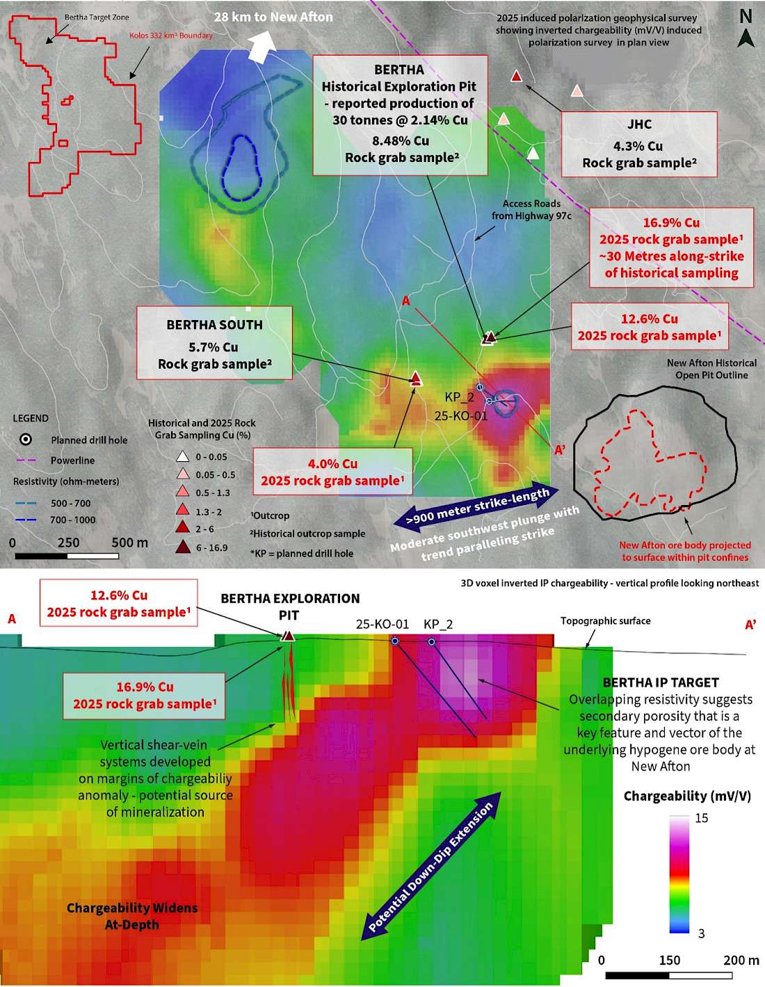 *Note that the information and comparisons disclosed herein to New Afton are not necessarily indicative of mineralization or assay results at the Bertha Zone or elsewhere across the Kolos Project area.