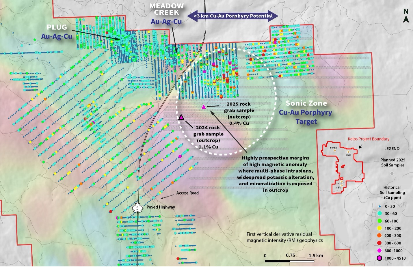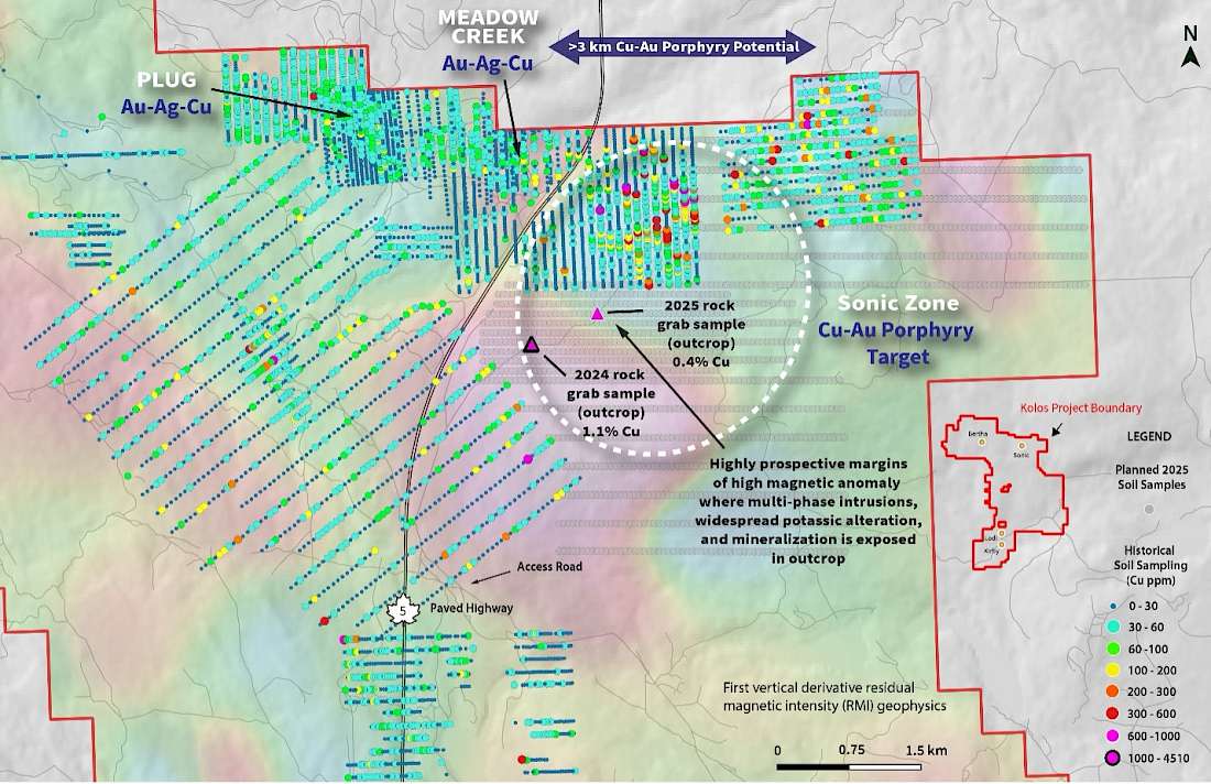 Figure 2. Sonic Cu-Au porphyry target showing historical soil geochemical data and select Torr rock grab sample locations within the area designated for the 2025 soil sampling program, overlain by first vertical derivative residual magnetic intensity (RMI) geophysics.