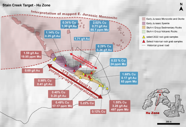 Malcolm Dorsey, President and CEO, commented, “These latest results have greatly advanced the Stain Creek mineralized trend as a primary undrilled exploration target, alongside our Dalvenie copper-gold trend. At Stain Creek, within the Hu Zone, we are seeing elevated copper, gold, and molybdenum coincident with highly magnetic geophysical anomalies that together with styles of mineralization at-surface form a very compelling potential porphyry cluster target across a significant 1200 m by 1500 m extent. We are also encouraged by results to date that have indicated a geological setting consistent with and similar to the Saddle North and Red Chris porphyry deposits, currently being advanced by majors ~60 km and ~75 km to the south of Stain Creek. With mineralization remaining open in all directions we are looking forward to further advancing the Stain Creek exploration target in 2023.”