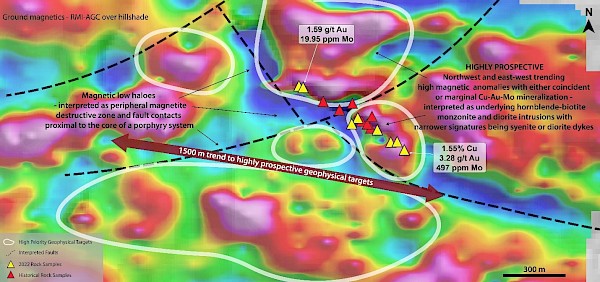 - Rock grab samples yielding up to 1.59 g/t Au and 19.95 ppm Mo within a strongly altered syenite intrusion,extending the mineralized trend by ~115 m to the northwest.