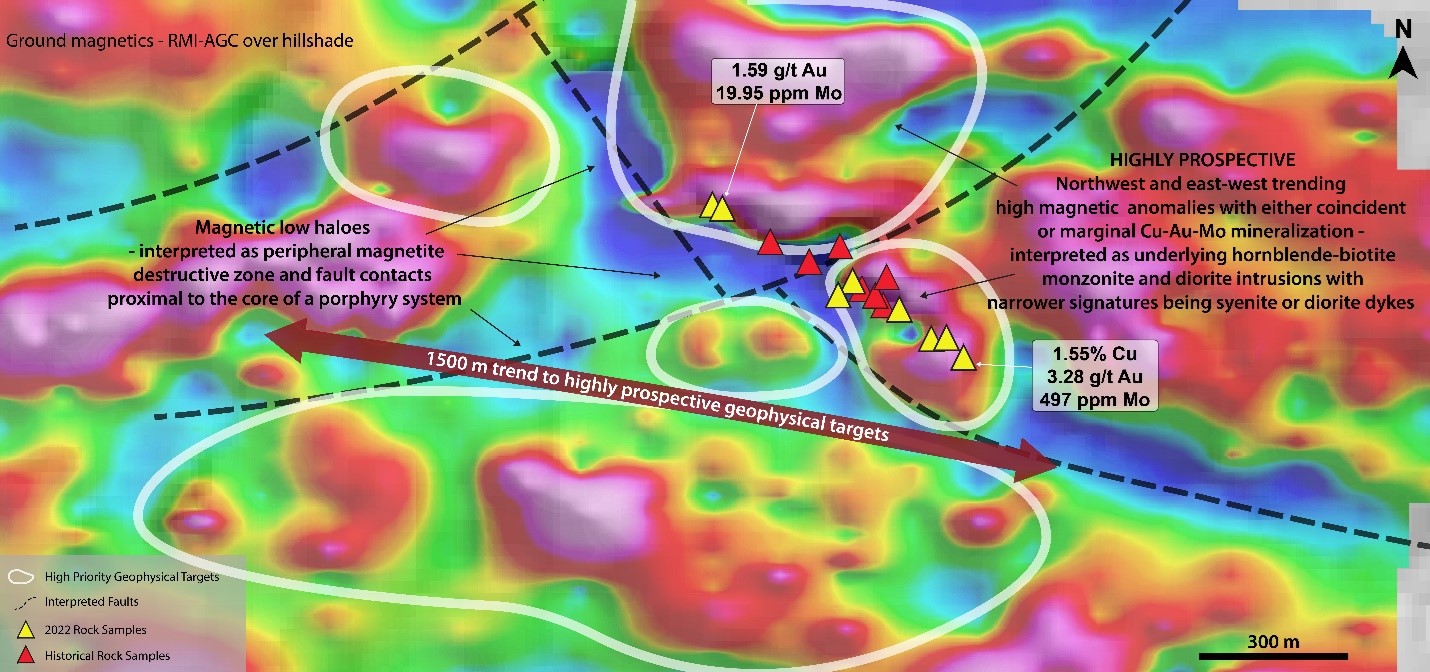 Figure 2. Reprocessed historical ground magnetic data showing the locations of rock grab samples, interpreted structural features, and high priority geophysical targets.