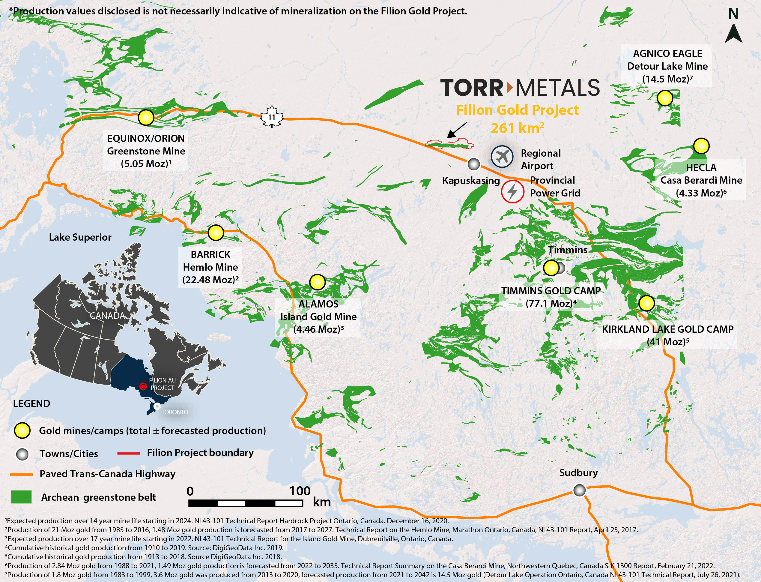 Figure 1. Filion Project location within the prolific gold-endowed greenstone belts of the Wabigoon, Wawa, and Abitibi subprovinces of northern Ontario. Figure includes the positions as well as total historical and forecasted production of major regional gold mines.