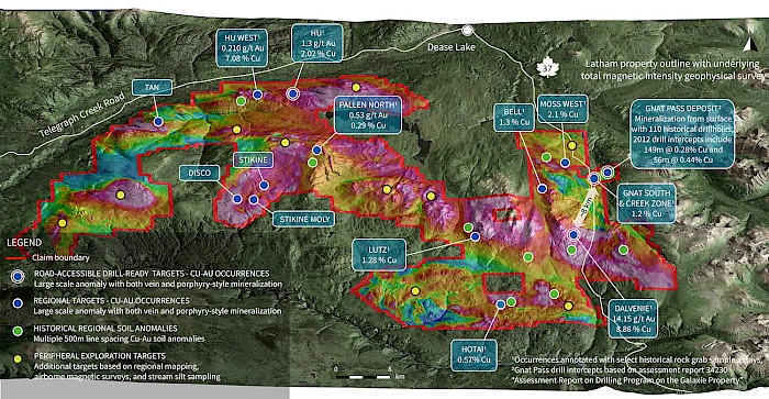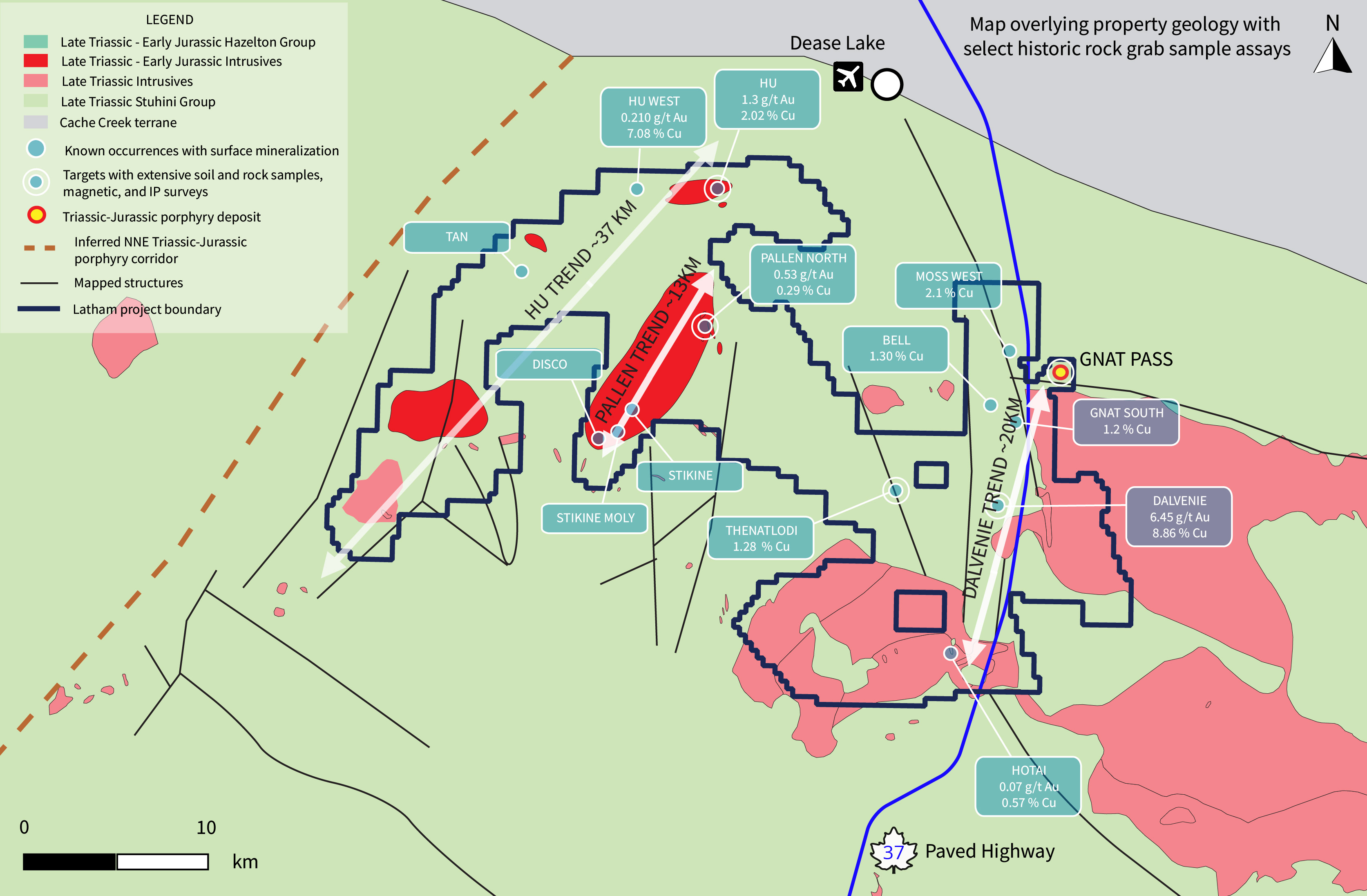 The Latham property and surrounding area has an exploration history dating back to the Dease Lake gold rush in 1899, followed by concentrated exploration activity during the 1960’s that led to the delineation of the Gnat Pass copper-porphyry deposit and mineral occurrences at Dalvenie and Hu. Since 1960 there has been at least 14 operators that have conducted a significant amount of work on claims that now constitute the Latham property, including the first regional exploration from 2011 to 2013 that identified an additional 11 mineral occurrences (Figure 3).