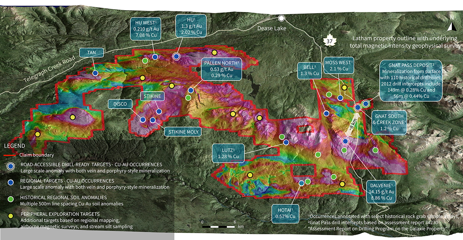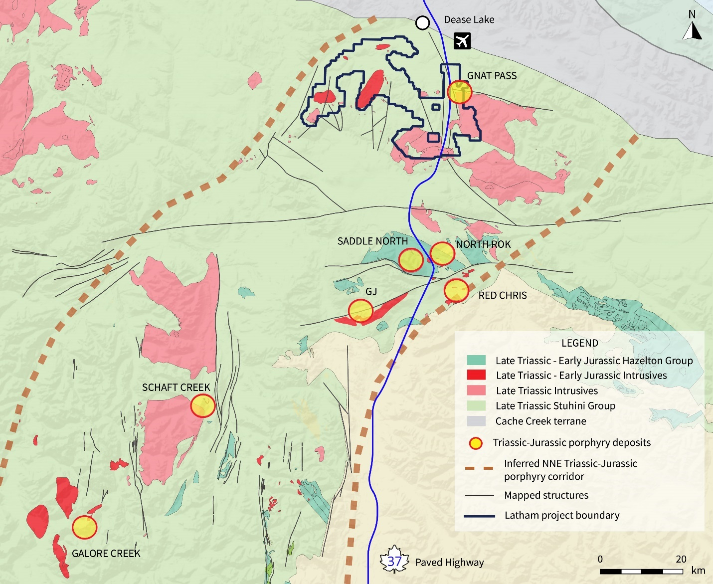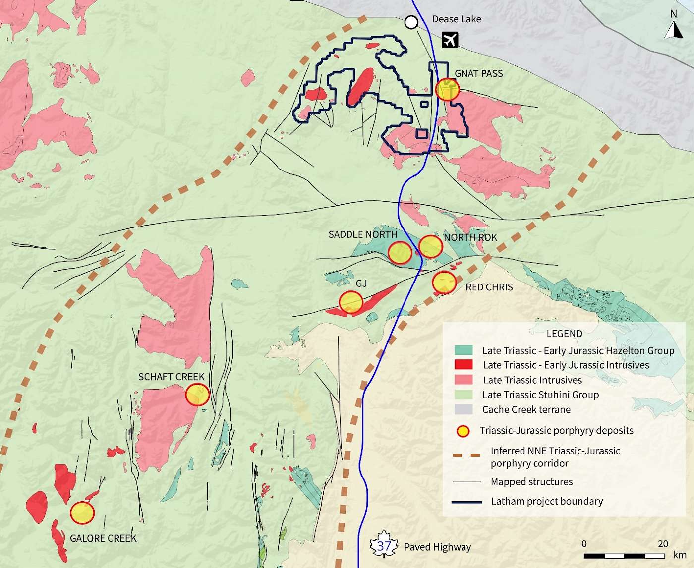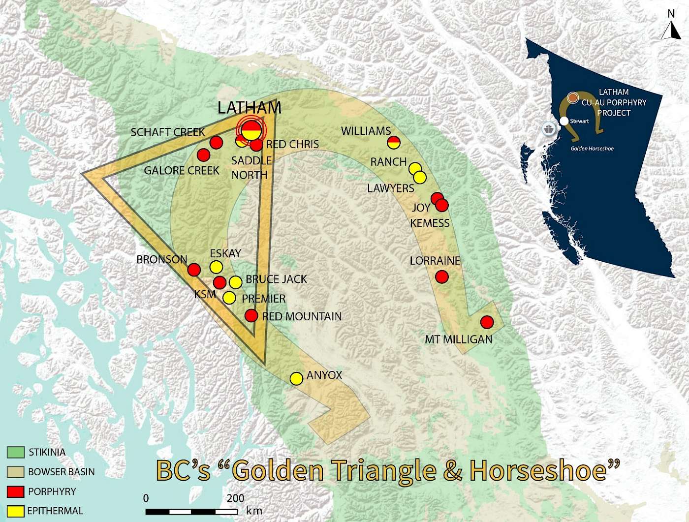 The district-scale Latham Copper-Gold Project covers a district-scale 689 km2 within the prolific “Golden Triangle” region, a section of the “Golden Horseshoe” arc of gold and polymetallic mineralization within the highly prospective Stikine terrane rocks of northern British Columbia, Canada (Figure 1). This region is also host to a number of proximal major copper-gold porphyry deposits along-trend to the southwest including the Red Chris, Saddle North, Schaft Creek, and Galore Creek deposits. The Golden Triangle and Horseshoe concepts provide a visual context for the mines, discoveries, and geological trends that concentrates porphyry and epithermal mineralization throughout the Stikine terrane.