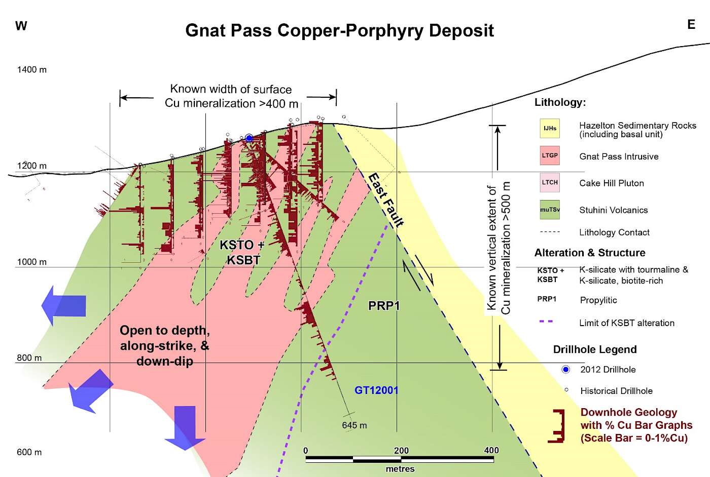 Zone Intercepts from 2012 Drilling at Gnat Pass Gnat Pass 35 metres @ 0.29% Cu from 29 metres depth in drill hole GT12001 Gnat Pass 149 metres @ 0.28% Cu from 95 metres depth in drill hole GT12001 Gnat Pass 56 metres @ 0.44% Cu from 360 metres depth in drill hole GT12001 Gnat Pass 21 metres @ 0.35% Cu from 487 metres depth in drill hole GT12001 Gnat Pass 103 metres @ 0.34% Cu from 94 metres depth in drill hole GT12002 Figure 4. Cross-section with displaying historical 1989 and 2012 drilling at Gnat Pass deposit.